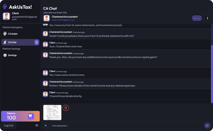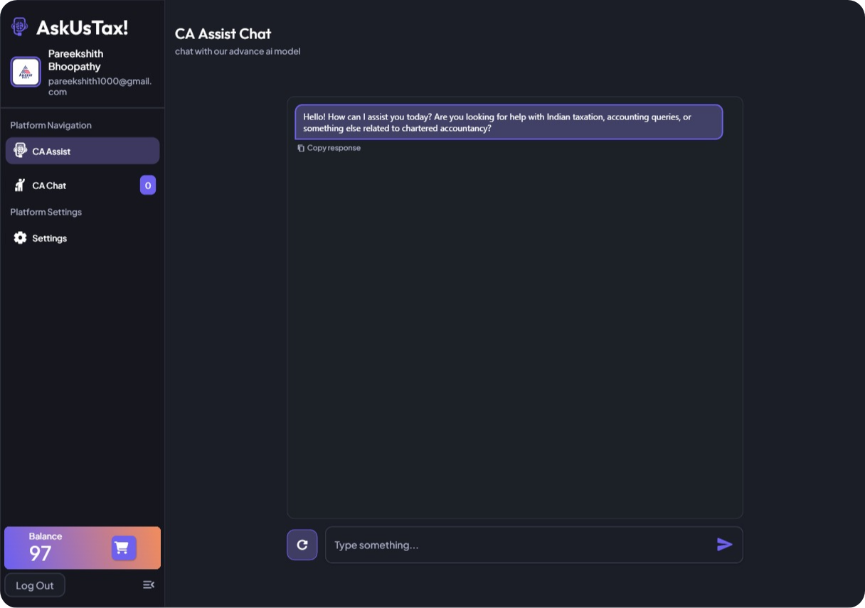 Navigate the complex world of Indian taxation with ease using AskUsTax. Our AI-powered platform provides instant, accurate answers to your tax queries, offers real-time consultations with experienced Chartered Accountants, and ensures you stay compliant with the latest tax laws. From income tax calculations to GST filing assistance, AskUsTax is your one-stop solution for all things tax-related. Experience the future of tax management today!